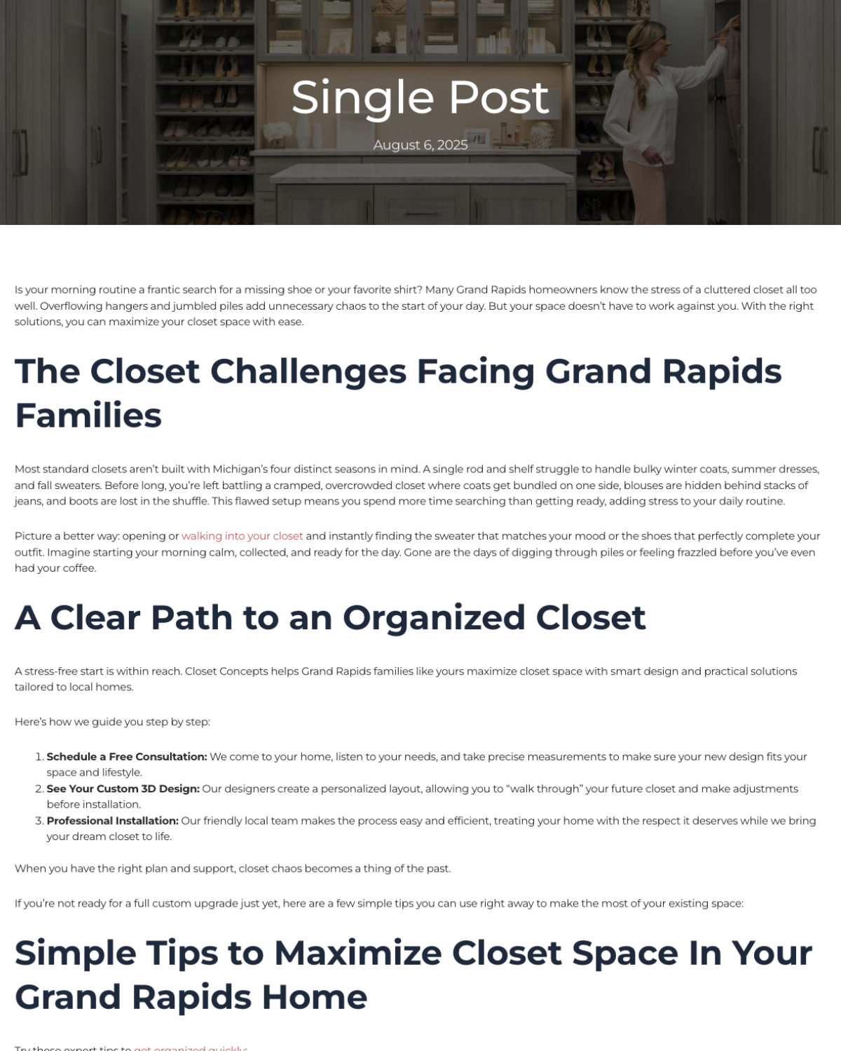 A blog post titled “The Closet Challenges Facing Grand Rapids Families” with tips for organizing closets and maximizing space, on a website with a simple white and gray layout. Closet Concepts of Grand RapidsBy Monirul Islam / November 20, 2025