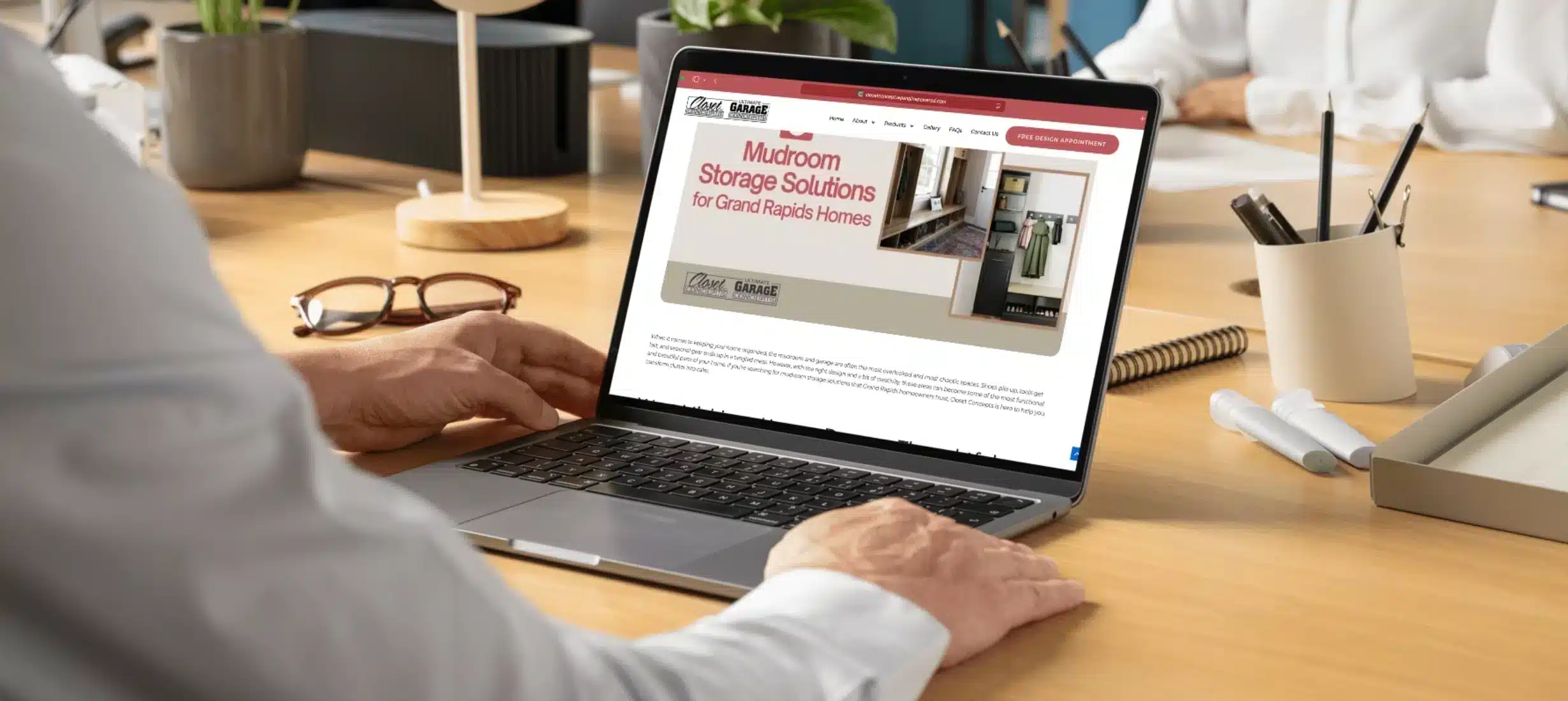 A person using a laptop at a desk, viewing a website offering mudroom storage solutions and closet systems for Grand Rapids homes. Closet Concepts of Grand RapidsBy Monirul Islam / August 6, 2025