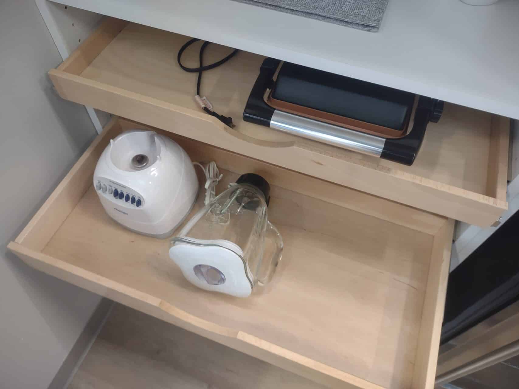Two open kitchen drawers; the top holds an electric grill, while the bottom stores a blender base with its jar—an organized setup reminiscent of efficient closet systems. Closet Concepts of Grand RapidsBy Monirul Islam / August 5, 2025