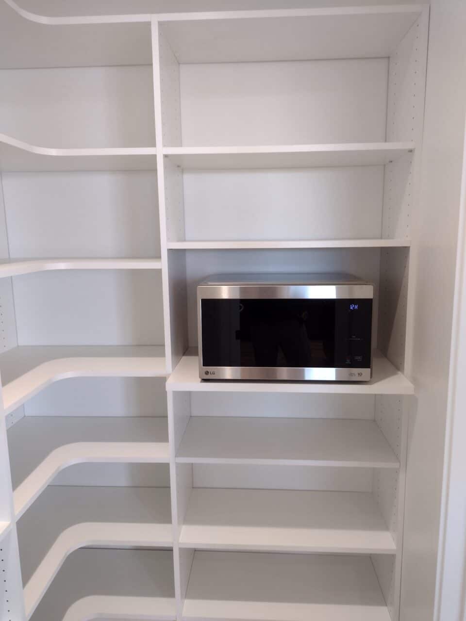 A stainless steel microwave sits on a shelf within a white built-in shelving unit, perfect for adding closet storage or complementing a walk in closet; other shelves remain empty. Closet Concepts of Grand RapidsBy Monirul Islam / August 5, 2025