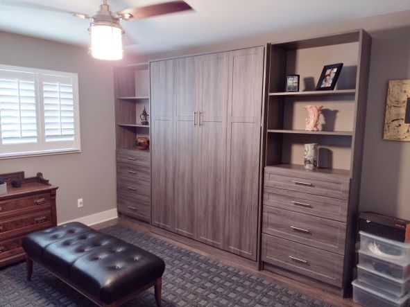A modern room features a large wall unit with cabinets, drawers, open shelves, a bench, wooden chest, and shuttered window—perfect for inspiring new closet concepts or adding a hidden murphy bed for versatile living. Closet Concepts of Grand RapidsBy Monirul Islam / August 5, 2025