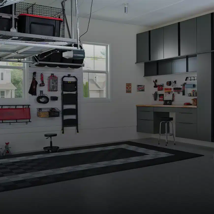A clean, organized garage with wall-mounted storage, cabinets, closet systems, a workbench, stool, and hanging tools. A large window lets in natural light. Closet Concepts of Grand RapidsBy Monirul Islam / August 3, 2025