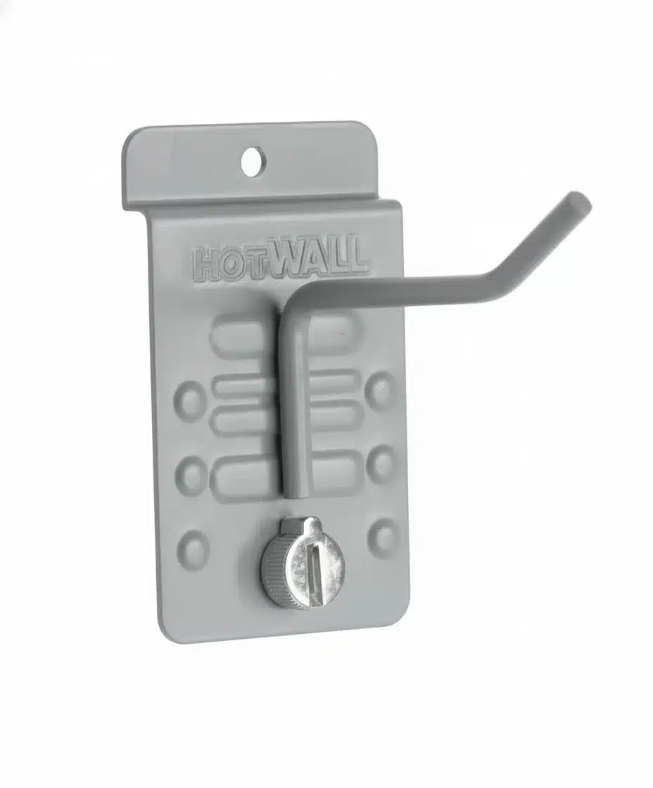 Our garage slatwall storage accessories feature our exclusive all-metal CamLok™. This amazing device helps keep accessories locked into the slatwall… until you decide to move them. An easy turn of the CamLok and your hook stays in position.  Nothing lands on the floor. Our Garage slatwall hooks are the best in the market for your slatwall job and garage organization project.