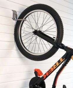 The J-Hook is a simple, elegant design allowing you to store your prized bicycles vertically to conserve slatwall space. Designed to hold any bike or trike with spoked wheels. Garage bike rack for vertical storage.