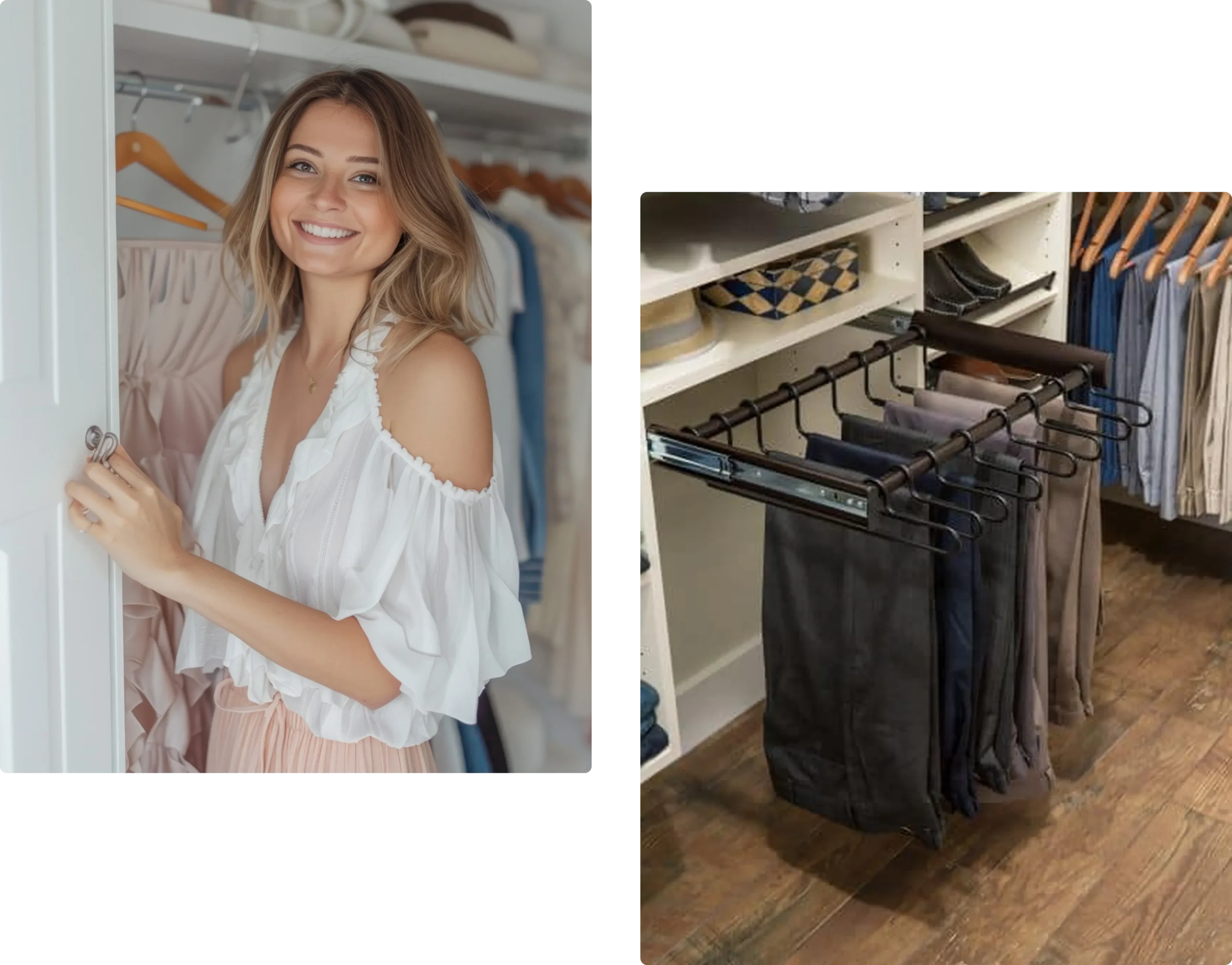 Transform your daily routine with a beautifully organized walk-in closet that blends function and elegance. Thoughtful design details like adjustable shelving, built-in drawers, and double-hang rods keep every piece within reach. Add a valet rod to plan outfits, display your favorites with open shelving, and tuck away the rest in a sleek built-in hutch. Every element is crafted to help you start and end your day in style.