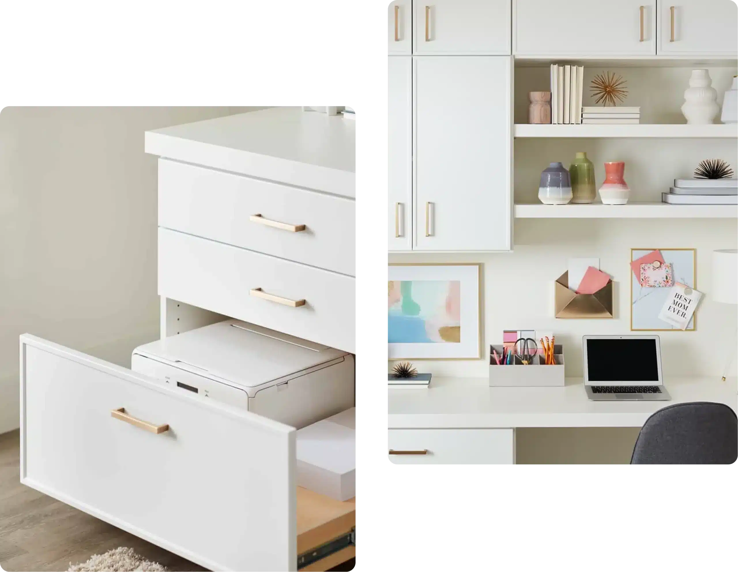 Side-by-side images of a white office setup: left shows drawers with a printer inside, right features a desk with shelves—highlighting how closet concepts can seamlessly organize your workspace. Closet Concepts of Grand RapidsBy Monirul Islam / August 6, 2025
