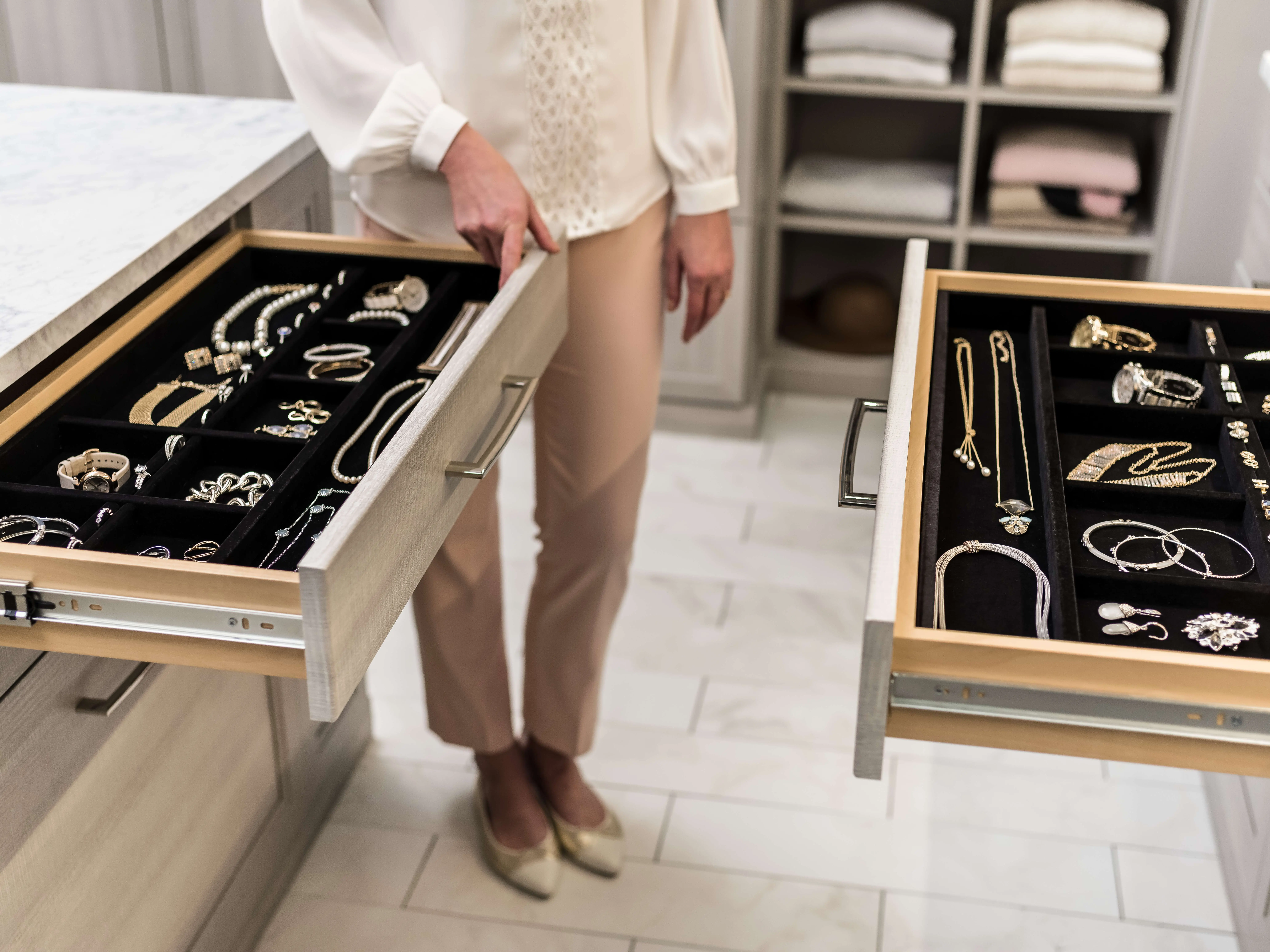 A person stands near an open drawer in a reach-in closet, pulling out another drawer, both organized with various pieces of jewelry—showcasing efficient closet storage. Closet Concepts of Grand RapidsBy Monirul Islam / August 7, 2025